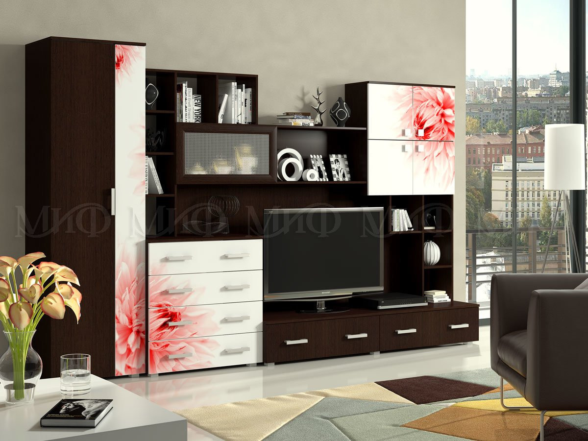 Гостиная Сицилия МДФ (Ш -3200 × В -2070 × Г-570 мм)/Венге + Белый Фотопечать на Выбор