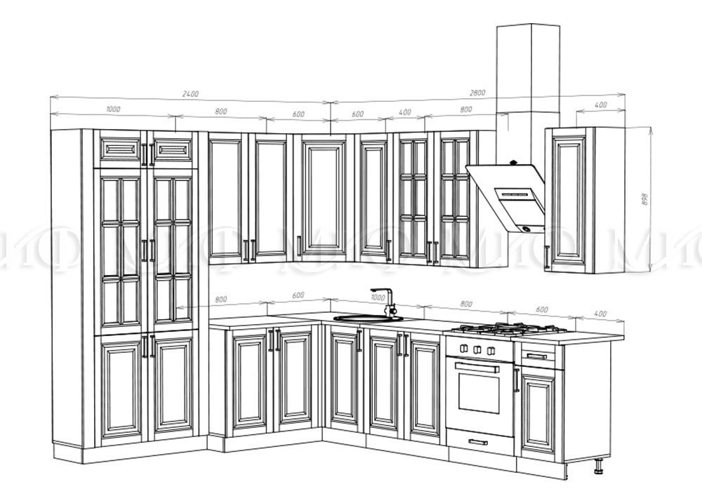 • Общие габариты Ширина 2400 х 2800 мм  x Глубина 600 (мм) по столешнице х Высота 850 (мм)