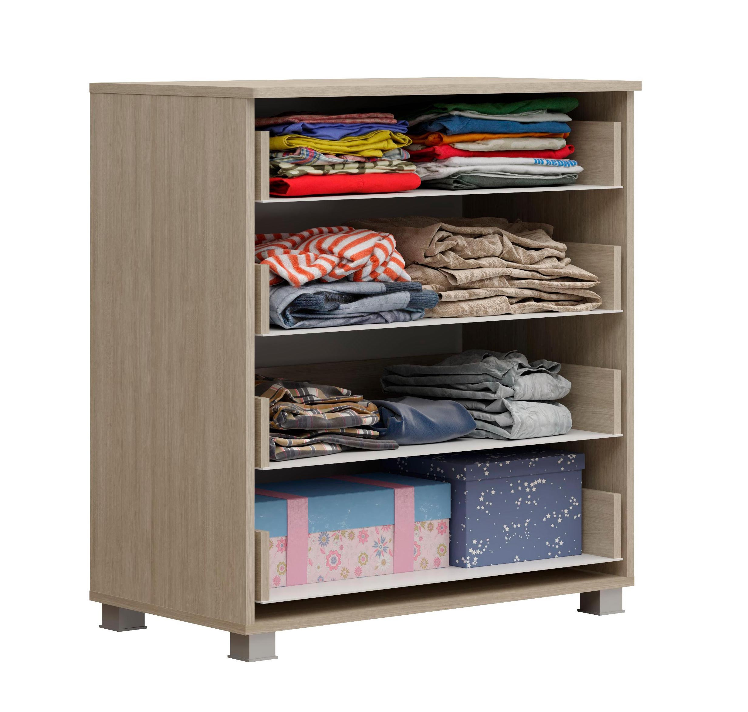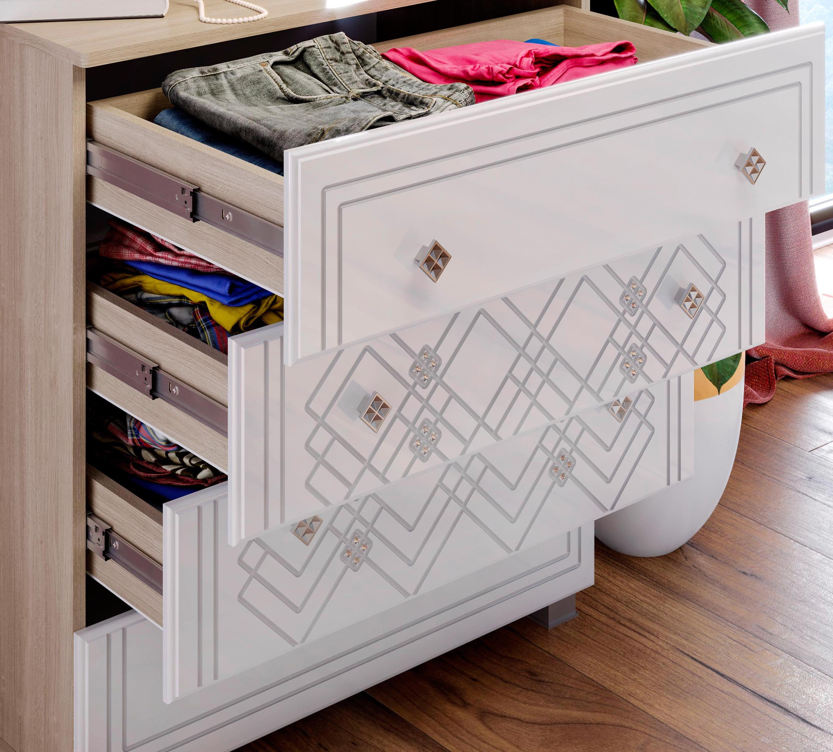 • Комод оснащен 4мя ящиками на шариковых направляющих полного выдвижения